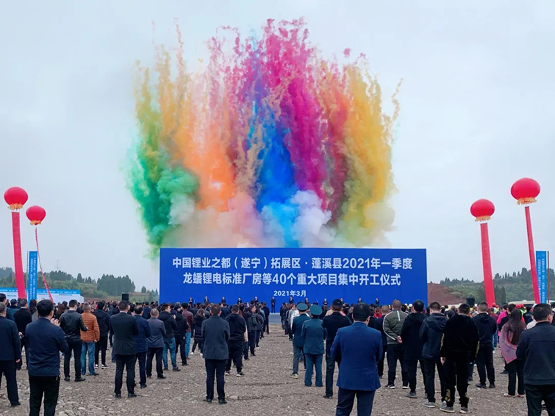 3月22日上午,中國鋰業(yè)之都(遂寧)拓展區(qū)·蓬溪縣2021年一季度龍?bào)翠囯姵貥?biāo)準(zhǔn)廠房等40個(gè)重大項(xiàng)目隆重舉行集中開工儀式。